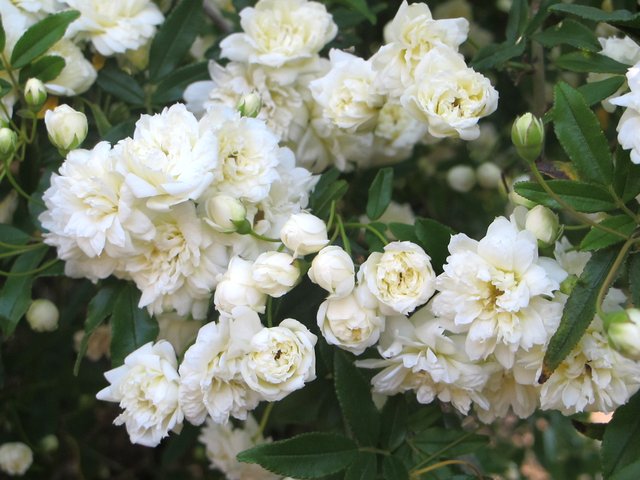 Un hybride à refloraison précoce a été élevé par des sélectionneurs nationaux en 1980. C'est un arbuste épineux étalé, de plus de deux mètres de haut. Les bourgeons d'un diamètre de 8 à 10 cm sont situés de manière très dense, se composent de pétales blancs comme neige et d'un centre jaune vif. La floraison dure du printemps à l'automne.