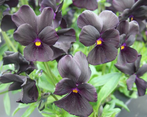 Le deuxième nom de cette fleur est pensées de jardin. Une plante bisannuelle compacte ne pousse pas plus de 0,2 m La période de floraison a lieu au début du printemps - début juin. Les fleurs sont petites, seulement 50-70 mm, pourpre d'encre, presque noires, avec un "œil" jaune vif.