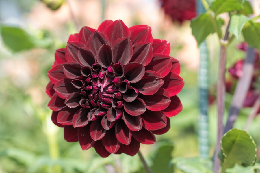 Grandes fleurs luxueuses qui fleurissent vers la fin de l'été - début de l'automne. Les tiges dressées et robustes forment un arbuste d'environ un mètre de haut. Les inflorescences sphériques sont pleines, veloutées, mesurant près de 25 cm.Les pétales sont noir-bordeaux, s'éclaircissent un peu jusqu'aux pointes, devenant comme des braises.