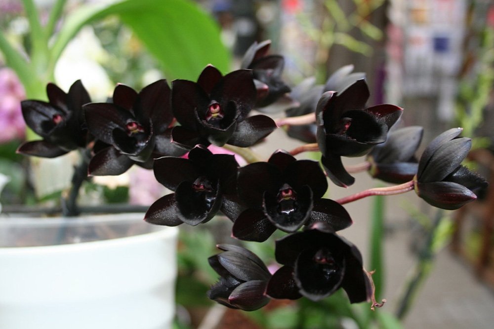 Phalaenopsis décoratif d'intérieur d'une hauteur d'un peu plus d'un demi-mètre. Selon la forme hybride, la couleur de l'orchidée noire se décline en différentes teintes - bordeaux, bordeaux, chocolat, violet ou rouge. Lors d'une longue floraison, la plante dégage un arôme unique de vanille.