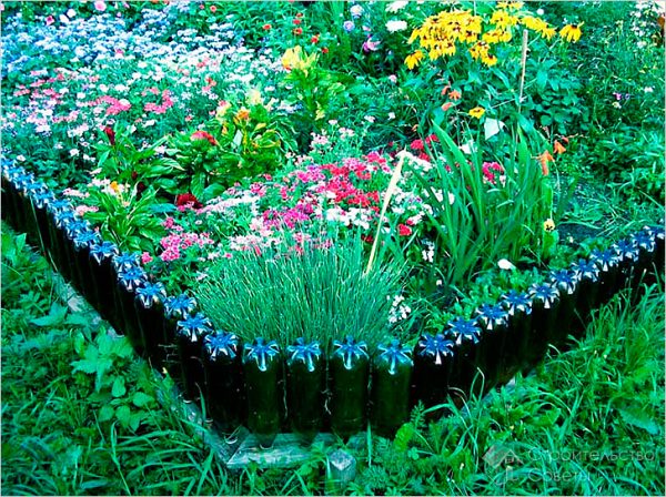 Souvent, les bouteilles sont utilisées entières. Il est plus facile de les enterrer jusqu'au milieu en position verticale avec le bas vers le haut autour du jardin de fleurs - voici la clôture. Vous devez d'abord les remplir de terre, de sable ou de petites pierres pour conserver leur forme. Il est très facile de réaliser une clôture décorative basse pour un parterre de fleurs à partir de bouteilles empilées sur un côté.