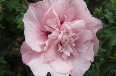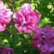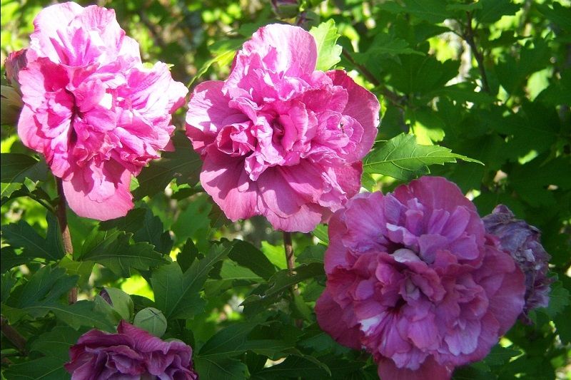 - Duc de Brabant. Grand hibiscus de deux mètres de haut et 1,5 m de large. Les fleurs sont densément doubles, presque 15 cm de diamètre. La couleur est rouge lilas avec une teinte violette.