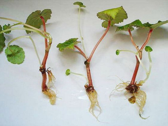 Un rameau de 7-8 cm de long est coupé d'une plante adulte. Les feuilles inférieures sont enlevées, ne laissant que 2 à 3 feuilles supérieures, qui sont légèrement coupées. Saupoudrer les sites coupés avec un antiseptique et insérer la pousse dans le sol. Couvrir le semis sur le dessus avec une bouteille ou un bocal en plastique. Le bégonia commencera à fleurir dans les 2 mois suivant la plantation.