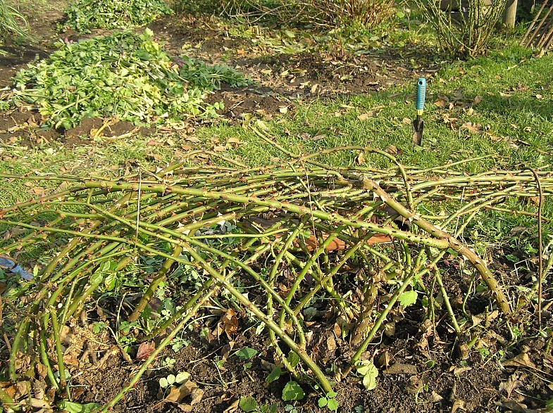 Dans les roses de thé hybrides et les floribundas, à l'automne, ils ne comptent pas le nombre de pousses qui devraient rester pour l'année suivante, ils enlèvent simplement ceux qui sont endommagés et raccourcissent le tout pour que le buisson s'insère complètement sous l'abri. Les variétés grimpantes, couvre-sol et broussailles sont raccourcies encore plus soigneusement, car toute leur beauté dépend de la longueur des pousses, et une taille excessive peut même les priver de la floraison l'année prochaine. La taille doit être terminée avec l'apparition de températures inférieures à zéro, toutes les coupes doivent être traitées avec du vernis de jardin, toutes les feuilles et branches doivent être retirées de sous le buisson, il est conseillé de toujours les brûler afin d'exclure les infections fongiques.
