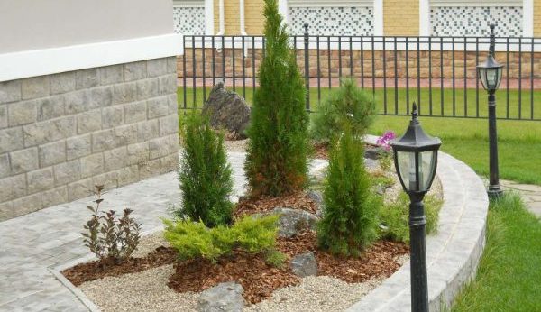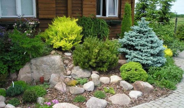 - au stade de la planification, vous devez décider des matériaux de finition utilisés pour l'encadrement et la décoration des parterres de fleurs - les conifères ont l'air plus efficaces dans un cadre en pierre;