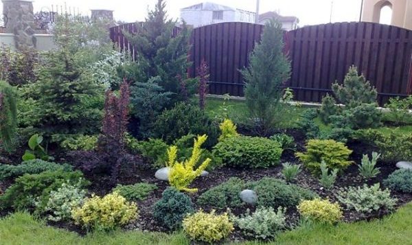 Ensuite, vous devez décider de la méthode de décoration d'un parterre de fleurs avec des plantations de conifères. Il peut y avoir plusieurs options de composition :