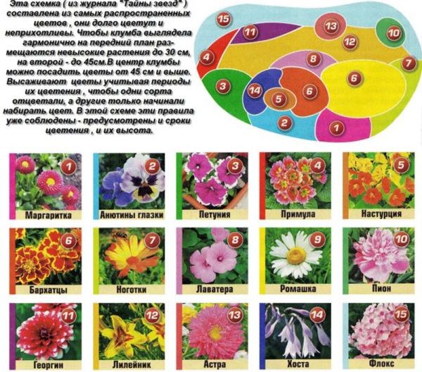 Pour que vous puissiez profiter de la beauté et des arômes des plantes plantées tout au long de la saison, du début du printemps à la fin de l'automne, il est nécessaire d'organiser correctement le jardin fleuri et la sélection de fleurs adaptées. Le principal secret pour les débutants dans la création d'un parterre de fleurs vivaces à floraison continue est de connaître exactement la période de floraison de chaque culture. Ainsi, planter plusieurs variétés, dont la période de floraison se remplacera progressivement, vous offrira un tapis floral parfumé et incroyablement beau toute la saison. La deuxième règle pour planter un tel parterre de fleurs concerne les caractéristiques d'entretien et les exigences des différentes plantes. Par conséquent, lors de la plantation d'un jardin de fleurs avec des plantes vivaces, choisissez des variétés ayant des exigences agricoles similaires. Pour vous repérer le plus précisément possible, dressez un schéma de plantation de vivaces en massif, d'abord sur une feuille de papier. Considérez les exemples d'atterrissage suivants lors de l'organisation :