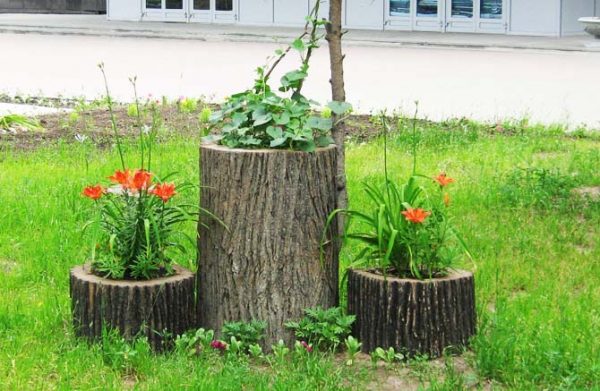 Une autre des façons les plus simples d'organiser une place pour les fleurs dans un chalet d'été consiste à utiliser des bûches solides. Cette option est particulièrement harmonieuse et élégante si la maison est en bois. Pour réaliser une telle conception de vos propres mains, vous devez choisir un matériau d'environ le même diamètre. Ensuite, ils découpent la longueur requise, retirent l'écorce des bûches et installent une clôture pour les fleurs. Les bûches prétraitées avec une composition antiseptique sont recouvertes d'un vernis foncé. Un tel jardin de fleurs fait maison s'intégrera à merveille dans le feuillage vert vif.