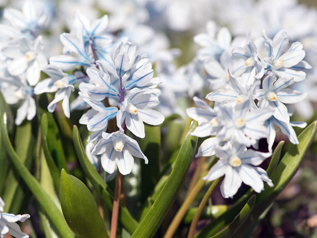 Le deuxième nom de la plante est la pushkinia scilloïde. Il pousse jusqu'à 10 cm, pousse mal à l'ombre et il est donc préférable de le planter dans des zones ensoleillées. Il tolère bien le gel même pendant la floraison. Après avoir fleuri, les pétales deviennent blancs avec une bande bleue.