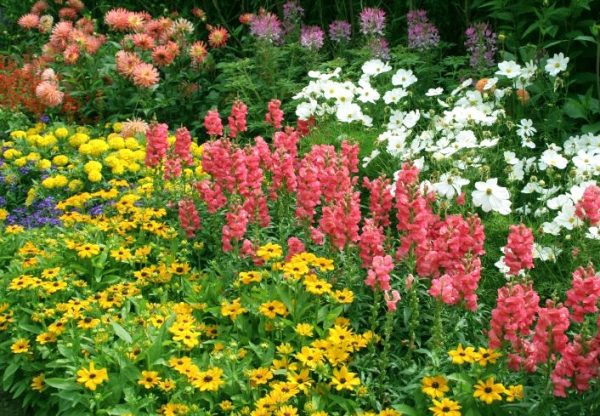 Un parterre de fleurs dans des tons roses sera obtenu à partir d'armerias, de floriums, d'astrantia, de géraniums, d'œillets à base de plantes, du même phlox. Un parterre de fleurs multicolores panaché nécessite une planification préalable. Idéalement, si les compositions sont composées de 3 à 5 couleurs primaires, un plus grand nombre peut rendre le parterre de fleurs chaotique et trop coloré.
