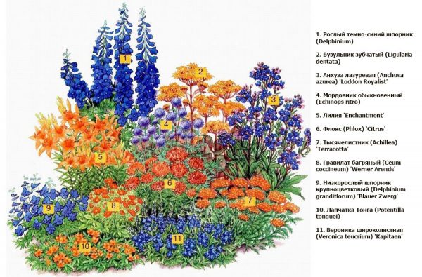 Des fleurs de taille moyenne jusqu'à 80 cm de haut sont utilisées pour les parterres de fleurs mixtes. Le point culminant du site peut être des boules de fleurs de verveine, d'antirrinum fantaisie, de pavot écarlate et de sauges lilas. La facilité d'entretien et la beauté extérieure ont rendu populaires l'escholtia jaune, la cosmée et la matiola parfumée. Les graines de ces plantes germent bien dans le jardin, les semis ne sont utilisés que s'ils souhaitent une floraison plus précoce. Ils ne sont pas capricieux, tolérants à l'ombre, un peu d'engrais et d'arrosage, un désherbage rapide est tout ce dont ils ont besoin.