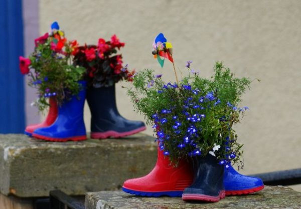 - parapluies - il est facile de créer de vos propres mains un véritable chef-d'œuvre de design à partir d'un vieux parapluie, si vous le posez sur la pelouse avec l'intérieur, versez de la terre, plantez des fleurs et peignez le parapluie lui-même de couleurs vives - il semble que dans un parapluie perdu accidentellement, au fil du temps, il a germé du sol et a fleuri un véritable jardin ;