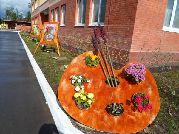 Vous devez d'abord décider de la taille de la palette, puis tracer un blanc sur le contreplaqué.Puis, à l'aide d'un cutter, découpez 8 trous : le central pour les pinceaux, et 7 dans un cercle pour les peintures (comme dans la vraie palette). Placez le parterre de fleurs sur des supports - pieds ou briques, vernis. Insérez des pots aux couleurs vives dans les trous.