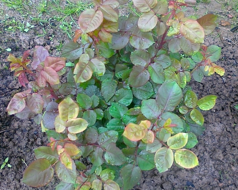 - Les feuilles des roses au fond du buisson jaunissent, probablement à cause d'un manque de lumière. Peut-être que l'individu grandit à l'ombre et en souffre.
