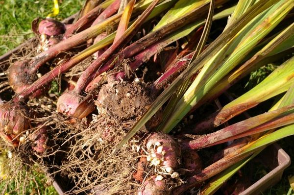 Il est nécessaire d'extraire la plante du sol avec le feuillage vert. Il peut être jauni dans les variétés hybrides et précoces de glaïeuls. D'abord, ils déterrent des variétés de glaïeuls précoces, puis moyennes et tardives. Une pelle est utilisée, avec laquelle la plante est soigneusement minée à une distance de 20 cm des tubercules.