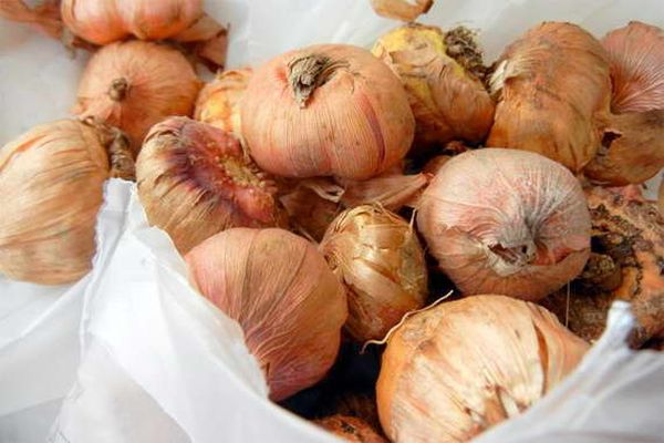 Les récipients pour placer les bulbes doivent être ventilés, vous ne pouvez donc pas utiliser de récipients en plastique sans trous ni de sacs en plastique. Lors de leur utilisation, le nombre de tubercules pourris et gâtés peut aller de 50 à 70% du total. S'il n'y a pas d'accès d'oxygène aux tubercules, le processus de décomposition commencera. Pour éviter d'endommager le matériel de plantation, nous vous conseillons de mettre une paire de gousses d'ail coupées en morceaux dans des boîtes. Vous pouvez également saupoudrer les bulbes de cendre de bois.