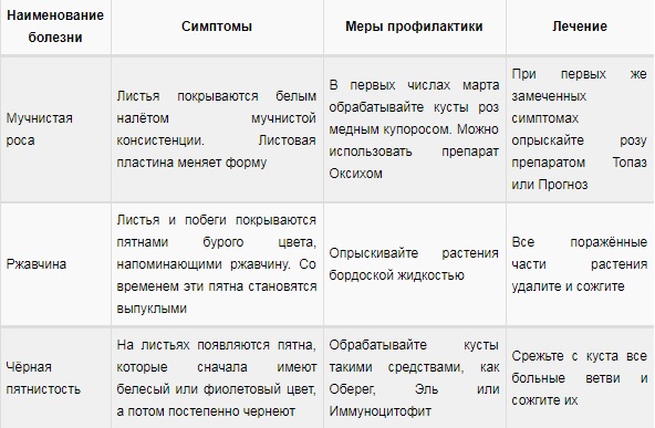L'un des inconvénients de la variété est sa faible résistance aux maladies et aux ravageurs. Si la plante commence à se faner ou à jaunir, les bourgeons ne s'ouvrent pas ou ne tombent pas, vous devez prendre des mesures d'urgence. Comment protéger une rose de la rouille, des taches noires et de la rose poudrée, voir le tableau ci-dessous :