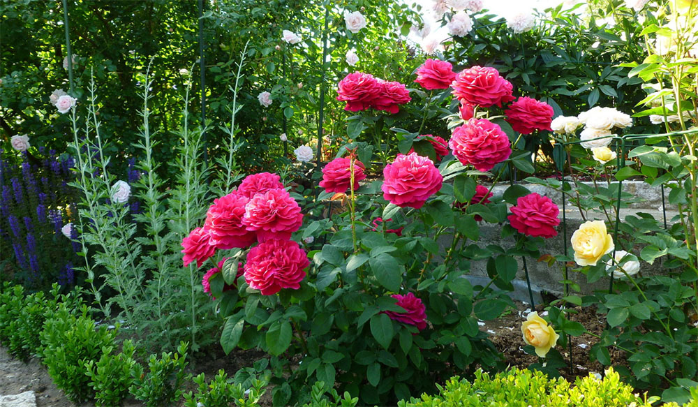 Les buissons sont plantés à une distance d'au moins 1 à 1,2 m les uns des autres, les plantations denses contribuent à la propagation des maladies fongiques et les racines ont besoin de beaucoup d'espace pour se développer. Une rose pousse bien dans des pots de fleurs ou des bacs séparés, il vous suffit de prendre suffisamment de profondeur pour qu'il y ait suffisamment d'espace pour une couche de drainage et de longues racines.
