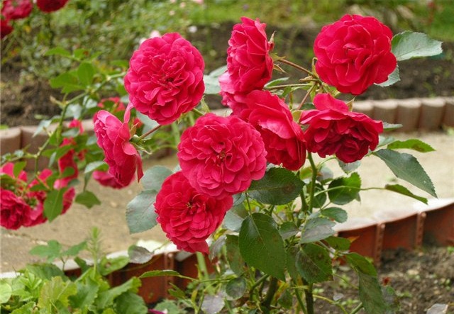 - Nina Weibull. Variété ancienne mais toujours très appréciée. Les fleurs sont rouge foncé, semi-doubles, petites (jusqu'à 6 cm), rassemblées en 3 à 10 morceaux dans les inflorescences. Les buissons sont compacts (jusqu'à 70 cm), densément feuillus.