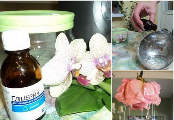 - Attendez 2-3 semaines, pendant lesquelles les fleurs sont progressivement saturées de solution de glycérine. La composition doit être cuite et ajoutée de temps en temps, en coupant à chaque fois la tige.