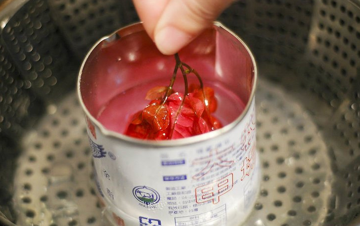 - tenant avec une pince à épiler, la rose est lentement trempée entièrement dans de la cire, légèrement chauffée et immédiatement retirée;