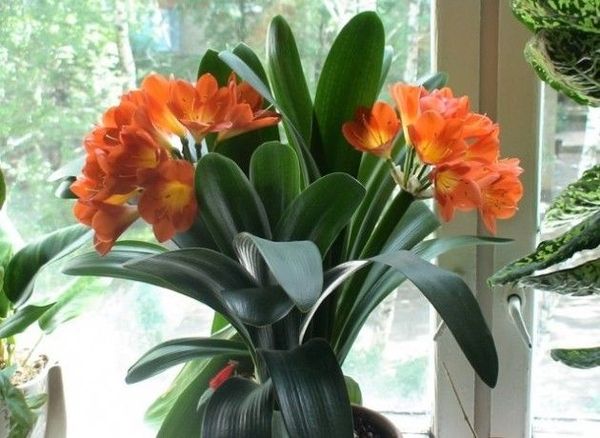 Clivia est un arbre à feuilles persistantes avec une rosette bien développée de grandes feuilles coriaces. Au moment de la floraison, la culture assomme un grand pédoncule avec un parapluie de fleurs orange vif.