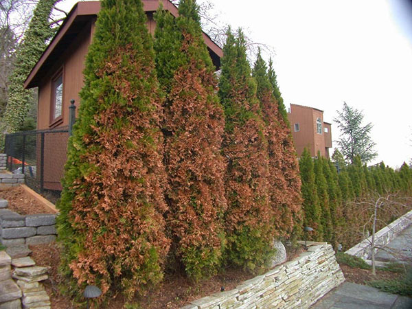 Un ennemi sérieux d'un thuya est un faux bouclier et des pucerons. La défaite des pousses, perceptible par le jaunissement croissant, peut détruire le biote. Pour vaincre les petits parasites, utilisez des produits chimiques tels que "Antio", "Karbofos", "Rogor".