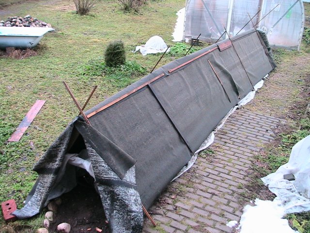 Pour se protéger des hivers froids, les écrans en polyéthylène peuvent être recouverts de feutre de toiture. S'il y a une couche de neige impressionnante sur l'abri, la température à l'intérieur de la structure ne baissera pas de plus de -10°. Lorsqu'il dégèle, les parois des huttes peuvent être ouvertes et ventilées.