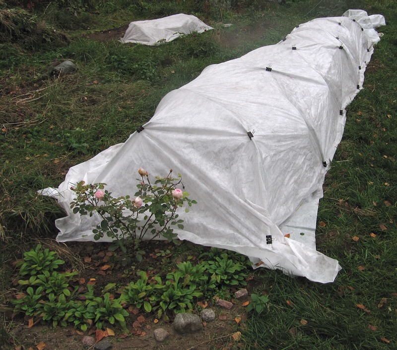 Il convient également de noter que vous ne devez pas utiliser de film comme matériau de revêtement. Après tout, cela perturbe les processus métaboliques naturels de la plante. Il est préférable d'utiliser une matière blanche non tissée (la couleur contribue au fait que les roses chauffent moins sous l'influence du soleil), dont la densité dépasse les 60 microns.