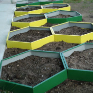 Une des particularités de ce type de jardin est la disposition des parterres dans des cadres. Afin d'économiser de l'argent, des structures en bois sont souvent utilisées, mais il existe de nombreux supporters et clôtures métalliques. Un métal correctement sélectionné et traité durera beaucoup plus longtemps que le bois. Cependant, tout le monde ne peut pas se permettre une telle option dans le pays en raison des coûts matériels possibles.