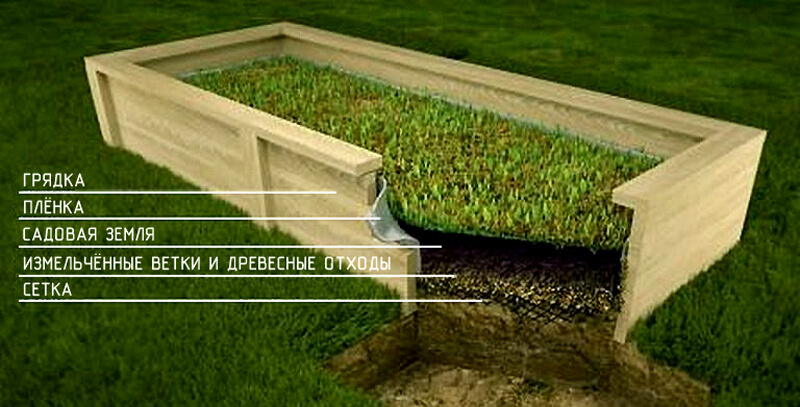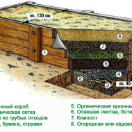 La boîte à cadre est remplie de terre et de matière organique et est abondamment humidifiée. Au printemps, la structure est recouverte d'un film pour accélérer le déroulement des processus biologiques. Pour l'hiver, recouvrez d'un film sombre pour que les mauvaises herbes ne germent pas.
