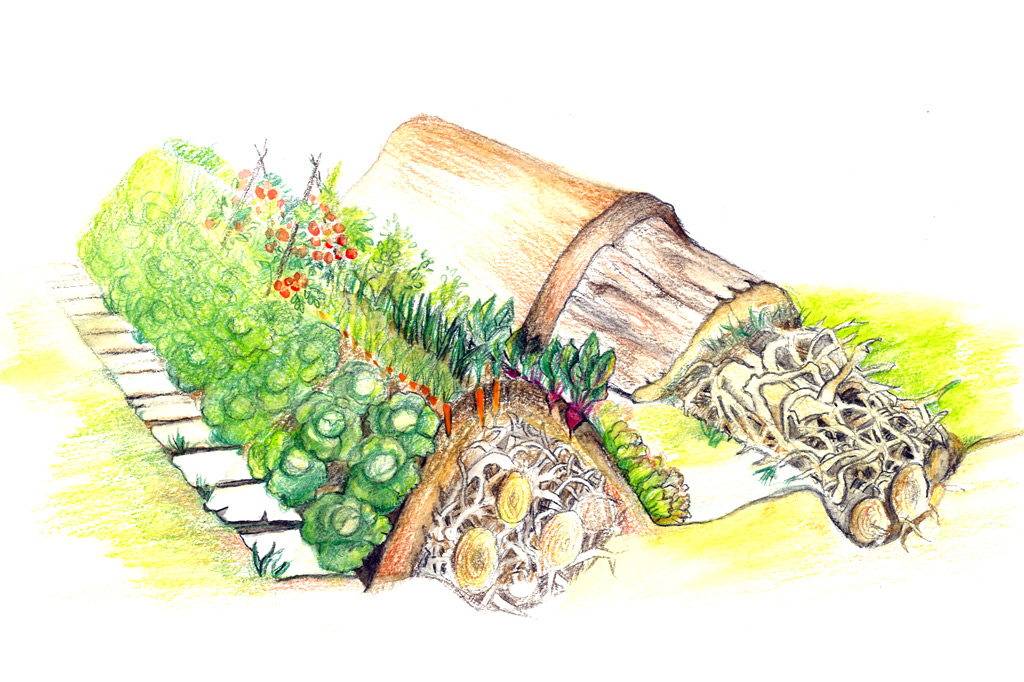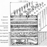 Les composants optimaux de la tranchée peuvent être les couches suivantes (de bas en haut) : des parties d'un matériau volumineux (chanvre, grosses branches, etc.), une couche de papier (journaux, vieux livres abîmés, carton), des parties de un arbuste, des pousses déchiquetées, du feuillage, du compost et de la terre.