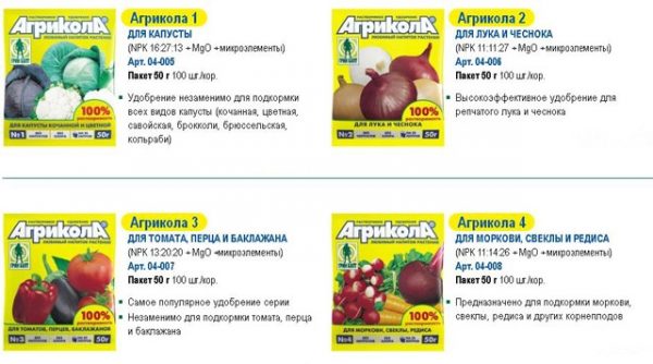 Le fabricant a créé de nombreuses variétés de ses produits, en fonction des besoins des différentes cultures : il existe des préparations séparées pour la morelle, les crucifères, le potiron, la feuille décorative, pour les fleurs d'intérieur ou d'extérieur. Par exemple, le chou a besoin de beaucoup de phosphore et les carottes ont besoin de plus de potassium, tandis que les semis ont surtout besoin d'azote, car ils doivent pousser activement. Il est recommandé de nourrir le chou avec Agricola 1. Un seau d'eau doit être dilué avec 20 g de la substance, appliqué pour la première fois 2 semaines après le débarquement, puis continuer avec le même intervalle.