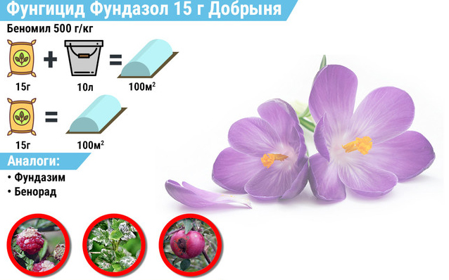 De plus, le produit a un effet superficiel. Lorsque les premiers symptômes d'infection fongique apparaissent, le jardinier doit pulvériser la plante affectée avec une solution de Fundazole. Cette procédure empêchera la propagation de micro-organismes pathogènes.
