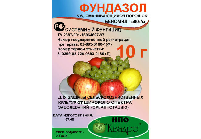 Fundazol est une substance blanche non volatile. Une caractéristique de l'outil est sa polyvalence géographique. En d'autres termes, le médicament peut être utilisé à la fois dans les régions du nord de la Russie et dans celles du sud.