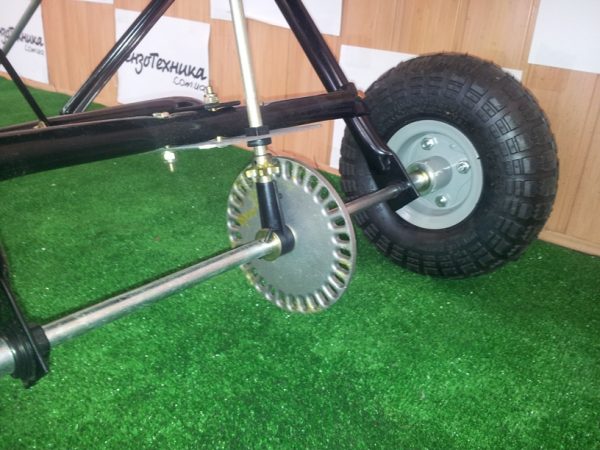 L'appareil manuel doit être poussé à travers le champ, ce qui n'est pas très pratique. L'épandeur porté est un cadre métallique fixé au tracteur avec des supports. La remorque à engrais est fixée au châssis à l'arrière. Une trémie à deux disques est installée sur le châssis, ils tournent grâce à l'arbre du tracteur, la force centrifuge force l'épandage de l'engrais.