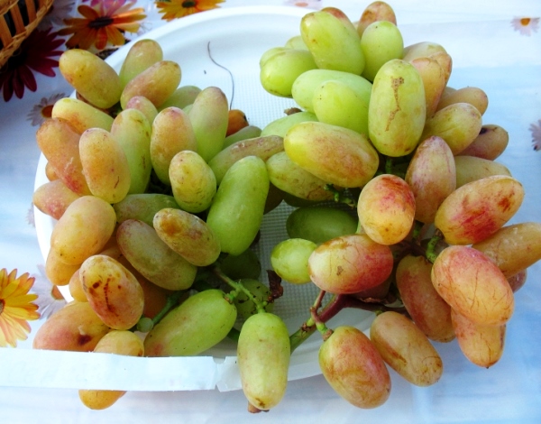 Les baies ont une belle forme de doigt. Leurs tailles atteignent généralement 55 x 25 mm et leur poids est de 16 à 30 g. Les baies peuvent aller du rose jaune au rose et, à pleine maturité, elles ont parfois même une teinte rougeâtre. La chair des raisins a un goût charnu, juteux, a un excellent goût et un léger arôme de muscade. Ils ont également une peau moyennement épaisse, qui ne se fait pas sentir en mangeant. Cette plante n'a pas besoin de soins attentifs, elle est donc souvent plantée dans les chalets d'été.