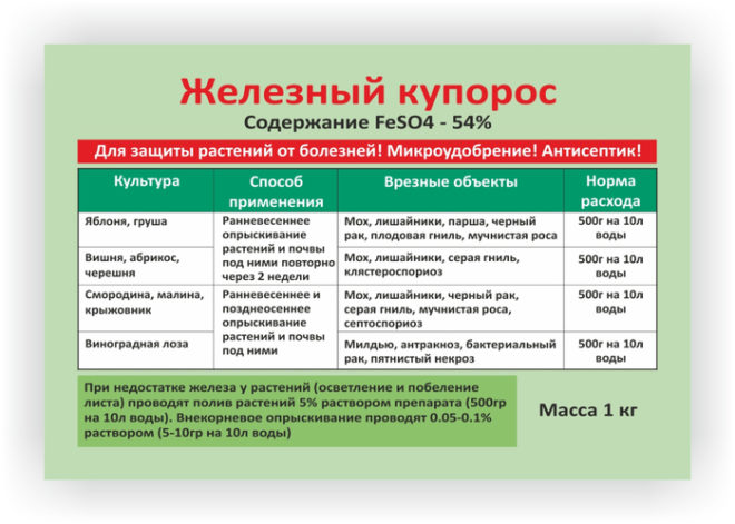 Pour le traitement des jeunes plantes, une solution à 3% de sulfate ferreux est utilisée (300 g de médicament sont pris pour 10 litres d'eau). Mais pour pulvériser des arbustes "âgés", il est préférable d'utiliser une solution de concentration plus élevée - 5%. Dans 10 litres d'eau, vous devez diluer 500 g de cristaux de sulfate de fer.