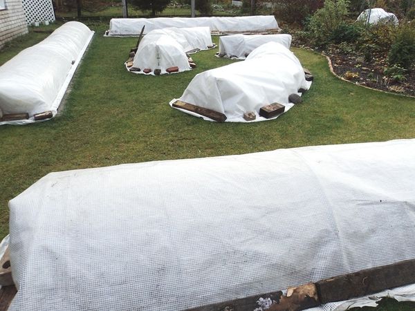 Pour abriter les plantes, il est préférable d'utiliser des branches d'épicéa - d'une part, cela garde bien la chaleur, de l'autre, cela laisse passer l'air. Une bonne option serait la toile de jute, saupoudrée d'une couche de neige sur le dessus.