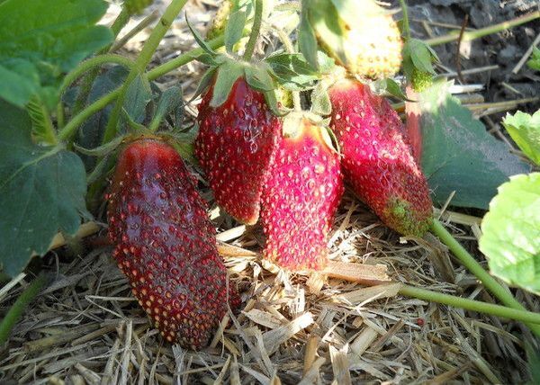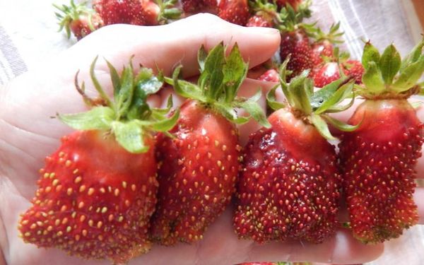 Les baies de marchand sont allongées, aplaties des deux côtés, de forme bizarre, avec des bifurcations et des processus divers aux extrémités. La couleur de la peau est rouge foncé. La taille varie: les plus grosses baies sont les premières, elles atteignent un poids de 17 à 20 g avec une longueur de 5 à 6 cm, les dernières sont petites, en moyenne 3 à 4 g. Goût de dessert et arôme de fraise avec une La teinte muscade est une carte de visite de la variété. Pour eux, la fraise a reçu la note de dégustation la plus élevée - 5 points.