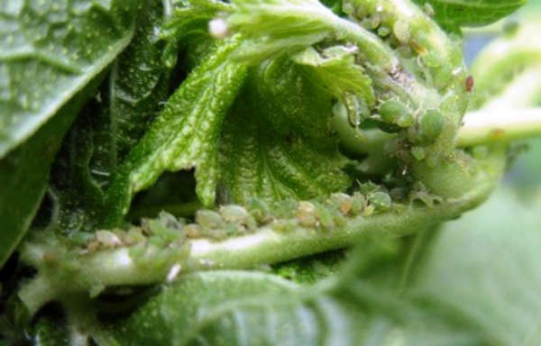 Les pucerons sont de minuscules insectes qui ne sont pas immédiatement perceptibles, mais que l'on trouve généralement lorsqu'une colonie entière s'est déjà multipliée. Les adultes et les larves se nourrissent de la sève des jeunes pousses et des feuilles, causant de gros dégâts à la plante. Les feuilles endommagées par les pucerons s'enroulent et les pousses ralentissent leur croissance. S'il était possible de trouver des insectes dès leur apparition, il suffit alors de vaporiser les groseilles à maquereau avec de l'eau savonneuse (300 g de savon / 10 l d'eau). Si les colonies ont réussi à se multiplier, des insecticides sont appliqués.