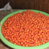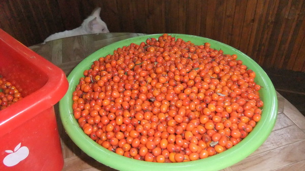 Les fruits de l'argousier sont vert clair avant de mûrir. Après maturation, couleur orange vif. Les drupes sont généralement ovales, petites. Mais ils couvrent densément les branches, de sorte qu'ils ne peuvent pas être remarqués sous un grand nombre de fruits. Plusieurs seaux de baies peuvent être récoltés dans un arbre adulte. La maturation des fruits se termine plus près de la mi-automne.