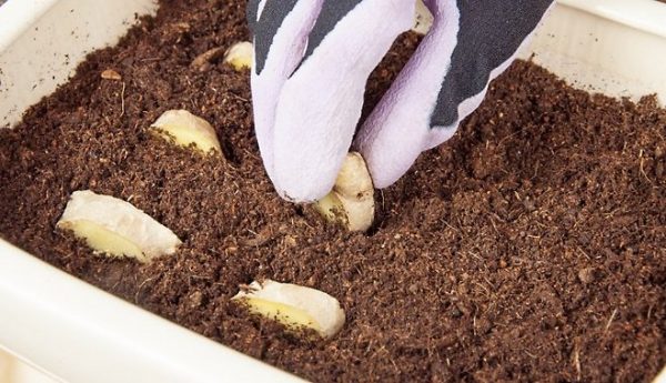 Couvrir la racine d'eau tiède pendant la nuit avant de planter. Cela réveillera les bourgeons dormants et donnera un bon départ pour le développement de la future plante. Coupez la racine en morceaux avec un couteau bien aiguisé afin que chaque morceau contienne quelques-uns de ces bourgeons. Les points de coupe peuvent être saupoudrés de charbon actif (ou de cendres) pour éviter les processus de décomposition. Notre matériel pour planter la racine de gingembre à la maison est complètement prêt.