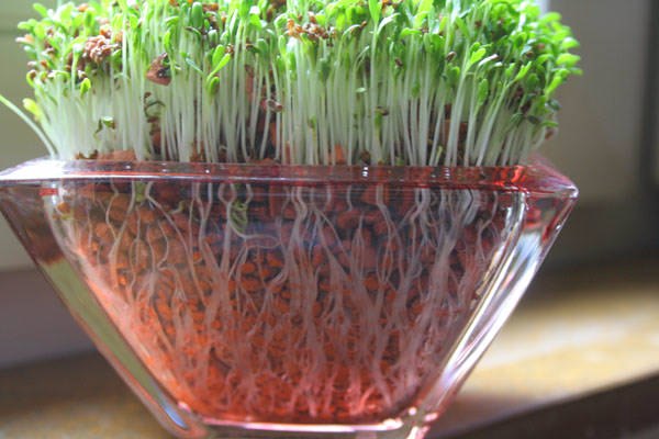 Le cresson de balcon peut être cultivé sans terre. N'importe quel récipient en plastique peu profond fera l'affaire. Sur son fond, vous devez poser une couche de gaze de 2 cm, du coton ou n'importe quel chiffon en coton, humidifier abondamment avec de l'eau, déposer les graines sur le dessus, préalablement trempées plusieurs minutes dans de l'eau tiède. Ensuite, le récipient est recouvert de papier d'aluminium et rangé dans un endroit sombre. Après l'apparition des premiers germes, le film est retiré et les germes sont soignés de la même manière que dans la description précédente.